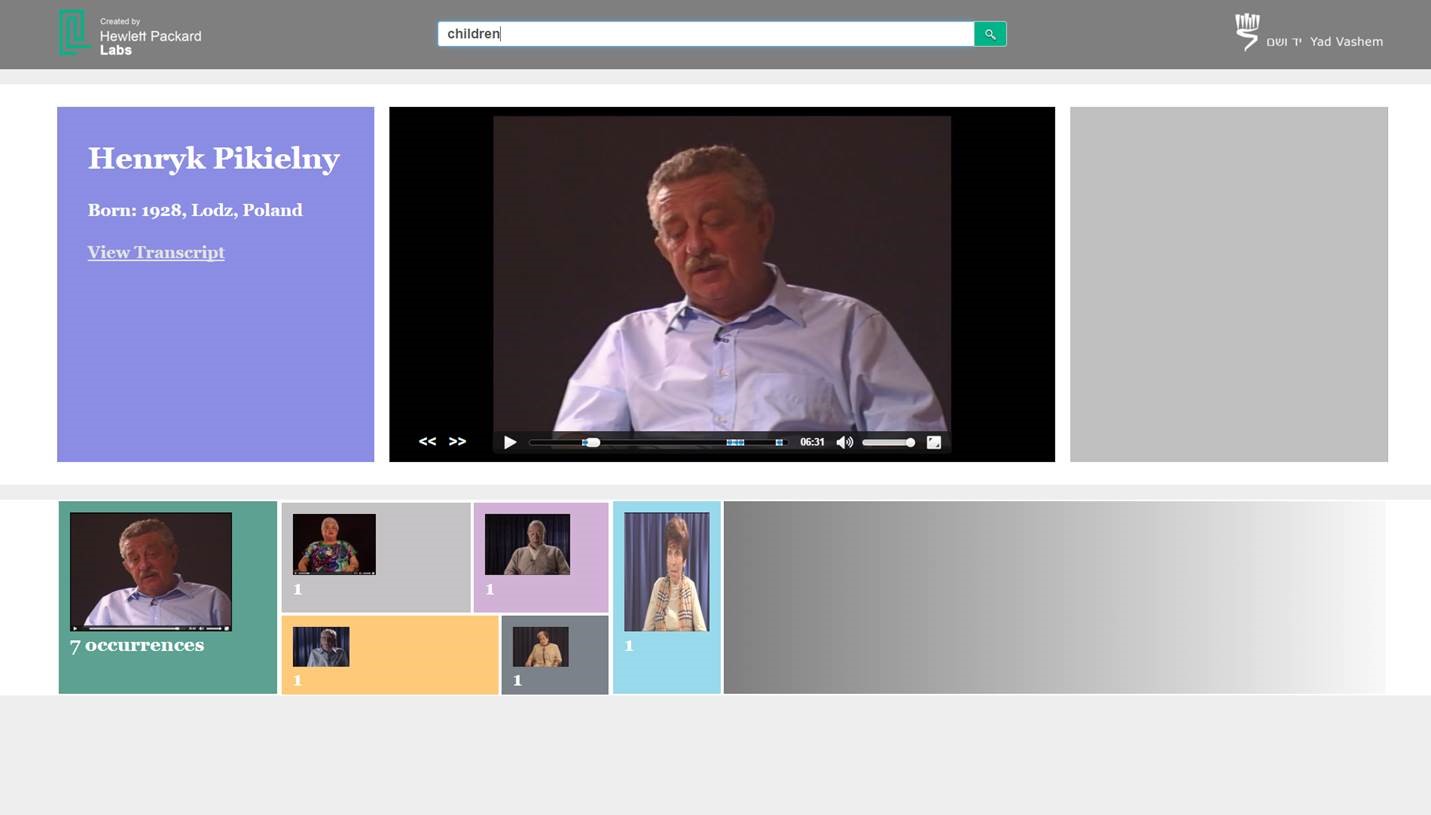 The Testimonies Become Searchable interface allows the user to enter search text, and presents the results in the form of videos that can be played from the moment the search term is mentioned. Each instance of the search term in the video has a marker users can click to skip directly to that location.