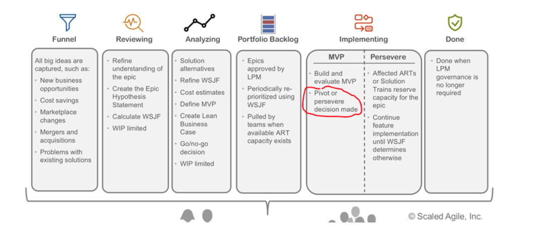Note, in the SAFe 5.0 preview below, the pivot or preserve decision has been moved out of the “Done” column, and into the “Implementing” column. Further, it allows for LPM oversight even after the original MVP.